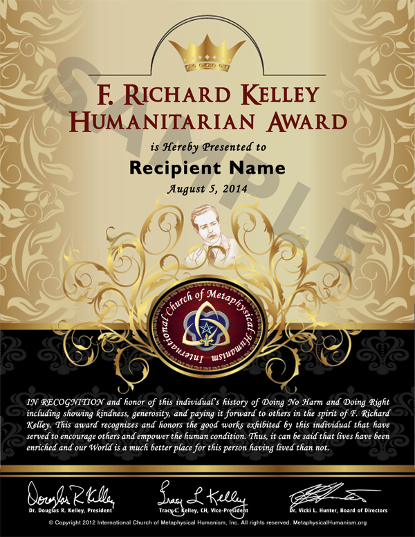 "IN RECOGNITION and honor of this individual’s history of Doing No Harm and Doing Right including showing kindness, generosity, and paying it forward to others in the spirit of F. Richard Kelley. This award recognizes and honors the good works exhibited by this individual that have served to encourage others and empower the human condition. Thus, it can be said that lives have been enriched and our World is a much better place for this person having lived than not."