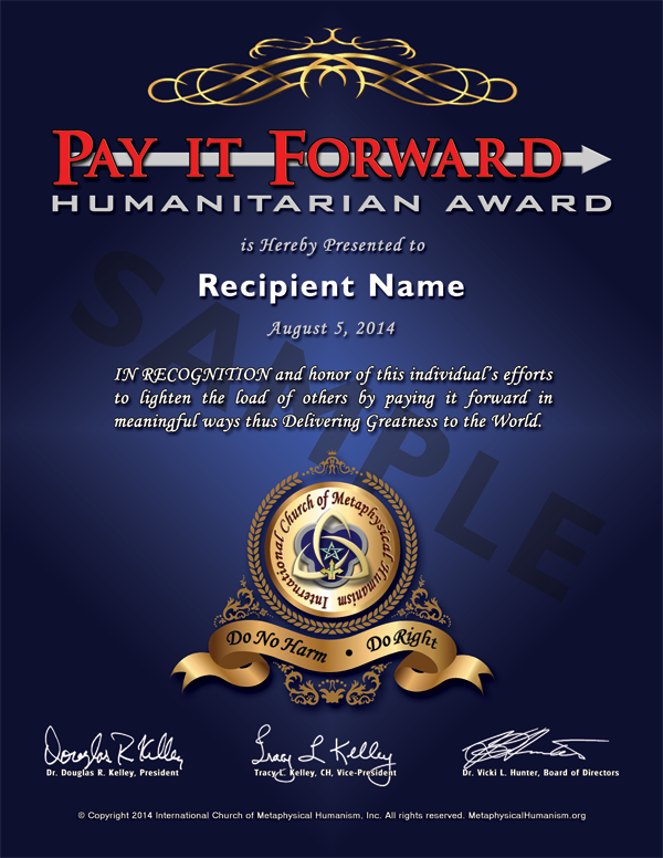 The concepts of Doing Right and Pay it Forward are among the foundational principles and Sacred Obligations of the International Church of Metaphysical Humanism (ICMH). It is only fitting, therefore, that ICMH offers humanitarian awards to recognize those individuals who Deliver Greatness in meaningful ways for the benefit of others. The criteria for the two humanitarian awards ICMH confers vary slightly (see below).